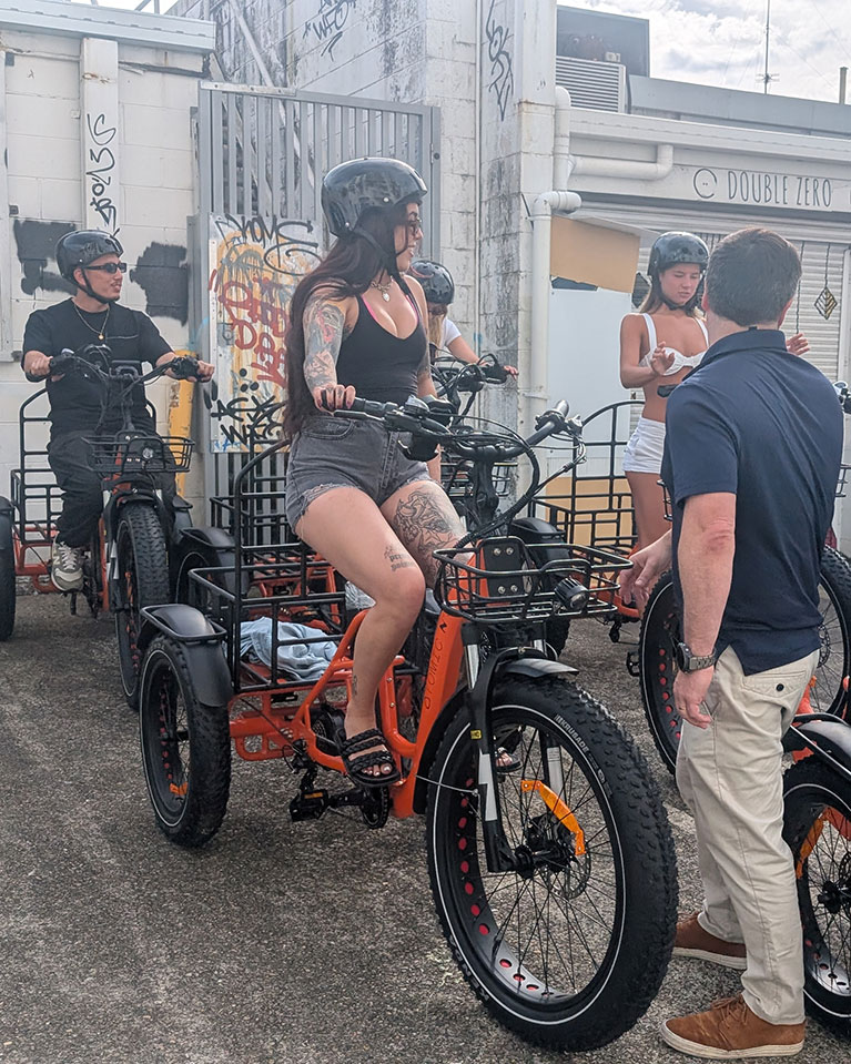 Designed for comfort, elegance, and everyday ease, the Sienna is our sleek, street-style electric trike. Also crafted in partnership with Atomic No. 3, it’s the most manoeuvrable model in our fleet — perfect for city riding, shopping trips, and relaxed beachside cruising.